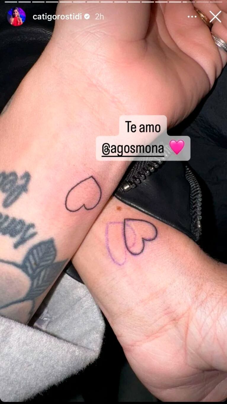 “Te amo, Agos”, escribió Cata en la foto que subió a su Instagram del corazón que estampó en su muñeca, al igual que su excompañera de GH.