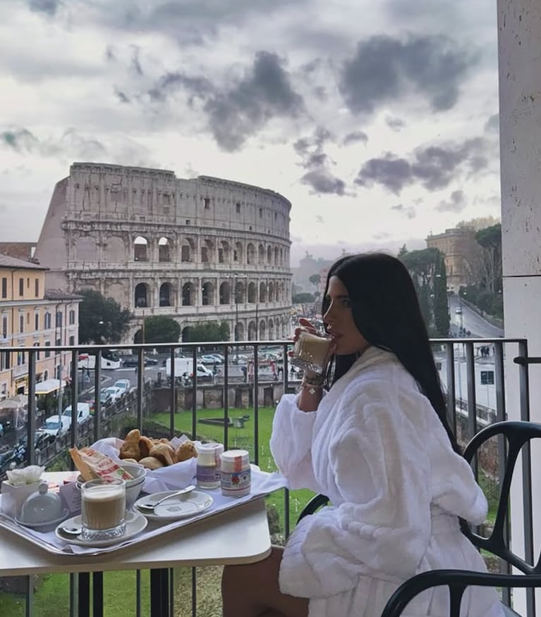 Valentina Cervantes posteó una foto desayunando en el balcón de su habitación, que da al Coliseo Romano.