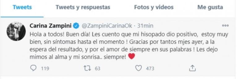 "Les cuento que mi hisopado dio positivo, estoy muy bien, sin síntomas hasta el momento", contó Zampini en Twitter.