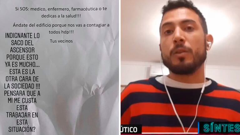 "Si sos médico, enfermero, farmacéutico o te dedicás a la salud, ¡andate del edificio porque nos vas a contagiar a todos, hijo de puta! Tus vecinos", expresaba el cartel anónimo con el que Fernando Gaitán, que trabaja en una farmacia, se encontró pegado en el ascensor una mañana antes de empezar su jornada laboral.