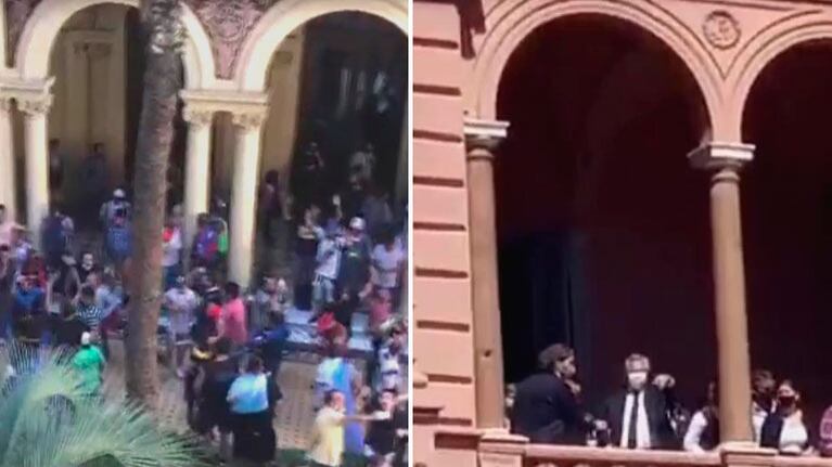 Los graves incidentes que se generaron entre la policía y los hinchas a raíz de la decisión de no ampliar el horario del velatorio de Diego Maradona en la Casa Rosada, se extendieron al interior del edificio donde una multitud copó el Patio de las Palmeras y obligó al presidente a pedir calma. En eltrece divulgaron imágenes del interior de la Casa de Gobierno y también de Alberto Fernández hablándole a la gente desde un balcón junto al jefe de Gabinete de ministros Santiago Cafiero.