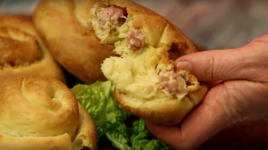 8) Estirar cada bollito formando un rectángulo largo y disponer el relleno en fila sobre un lado.