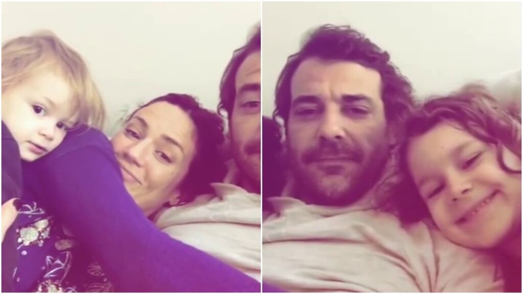 “Al fin solos”, se lo escucha decir al actor, mientras las voces de los chicos se escuchan a lo lejos. “¡No, yo también! Todos están juntos en la familia menos yo”, interrumpe Olivia, unos segundos después mientras ellos lanzan una carcajada, y la pequeña se suma. Después se une al cuadro el pequeño Baltazar, mientras permanecen abrazados.