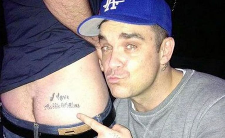 Simple: el joven tenía tatuada la frase “Yo amo a Robbie Williams”… ¡en su cola! Increíble, pero real. La imagen fue captada por el comediante Jack Whitehall, quien la subió a su cuenta de Twitter para compartir la osadía del fan de Robbie con sus seguidores.