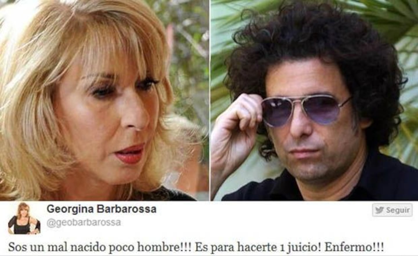 La contienda no terminó ahí. Una de las famosas que se indignó con el músico fue Georgina Barbarossa, quien usó Twitter para escribirle a Calamaro. “¡¡Sos un mal nacido, poco hombre!! ¡Es para hacerte un juicio, enfermo!”, expresó. Él respondió seco: “Soy un caballero, estás mal informada”.