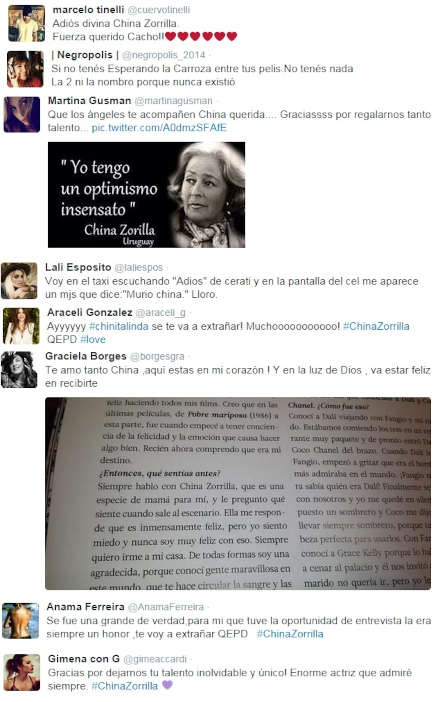 Belén Francese: QEPD #ChinaZorrilla una grosa. Silvina Escudero: GENIA, ÍDOLA, ARTISTA IMPECABLE!!! #QEPDChina #ChinaZorrilla.