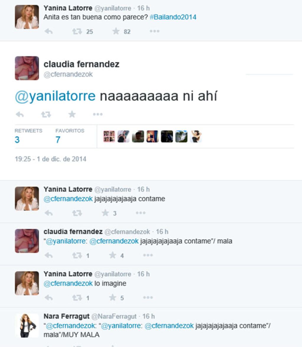 "¿Anita es tan buena como parece? #Bailando2014", preguntó Yanina Latorre y Claudia Fernández respondió: "Ni ahí. Mala".