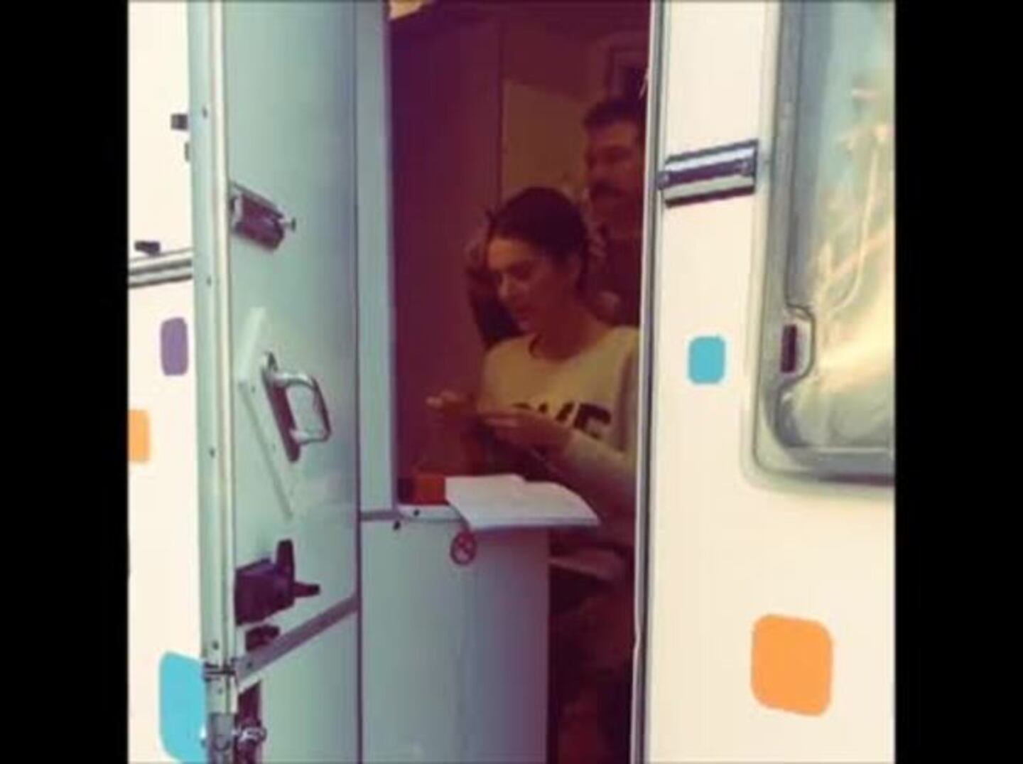 Mientras la peinan en el motorhome para su personaje, la bella actriz no pierde de vista el libreto del film ni su hobbie.