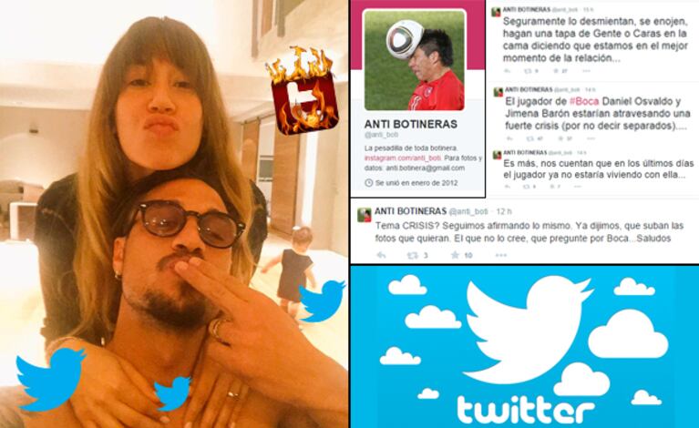 "Seguramente lo desmientan. Daniel Osvaldo y Jimena Barón estarían atravesando una fuerte crisis. Él ya no estaría viviendo con ella", dispararon desde el Twitter de Anti boti.