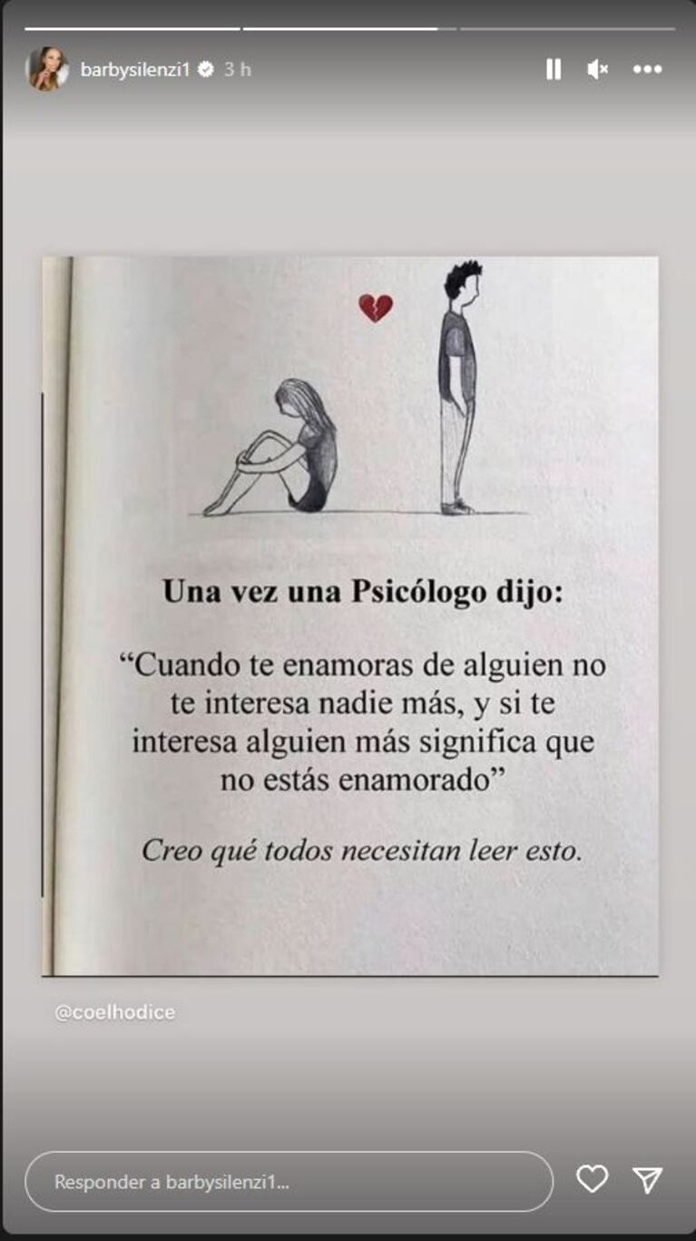 Barby Silenzi usó sus stories de Instagram para dar un llamativo mensaje. El texto, que habla del desamor, hizo que muchos de sus seguidores imaginaran que está otra vez en crisis con el Polaco.