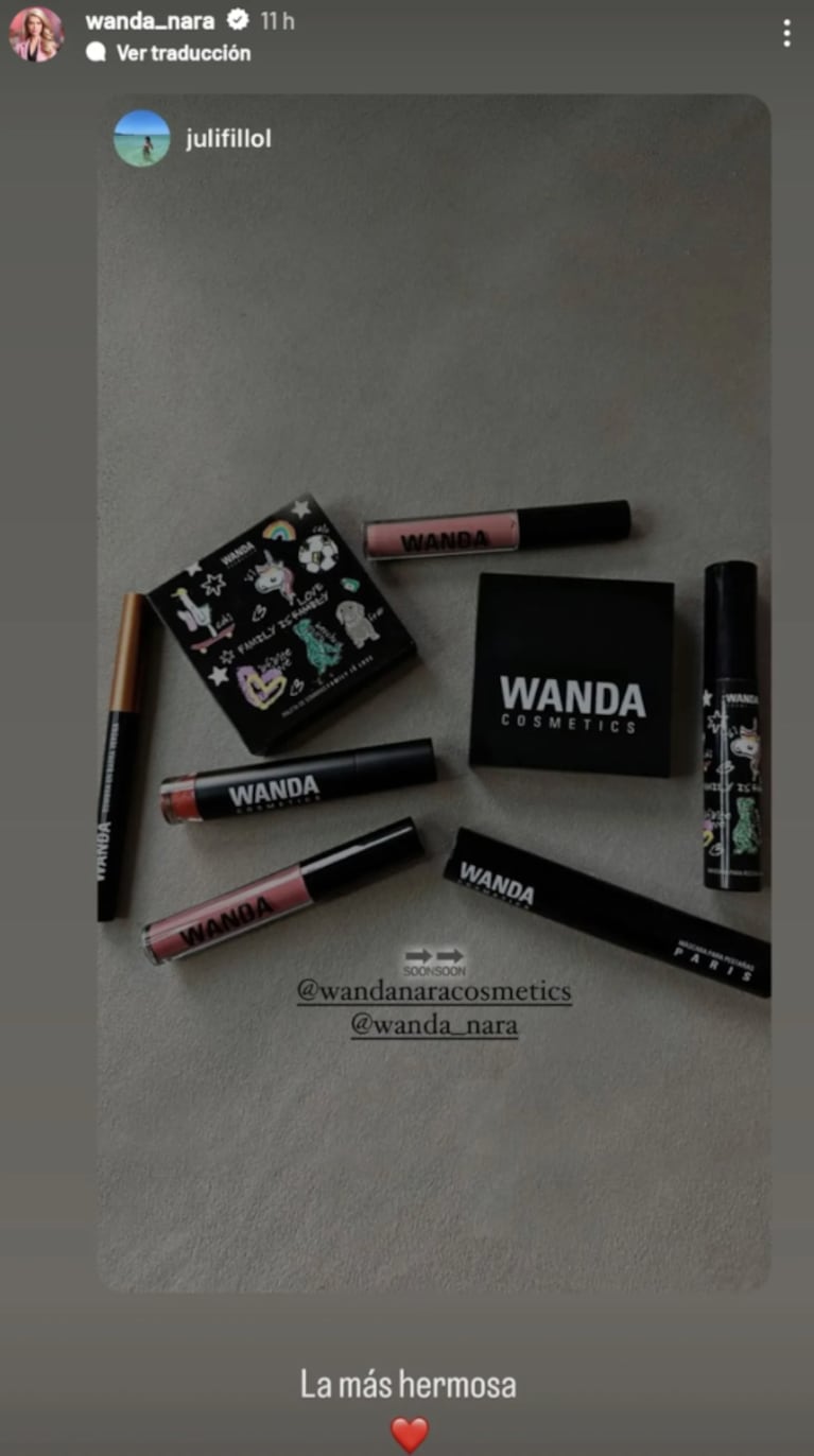 Juli compartió a través de sus stories una foto de los productos de make up que Wanda le regaló de su marca, Wanda Cosmetics: labiales, rubores, delineadores y más. Agradecida por el gesto de su nuera, Nara le dijo cuánto la quiere. “Es la más hermosa”, le dedicó junto a emojis de corazones. ¡Suegra copada!