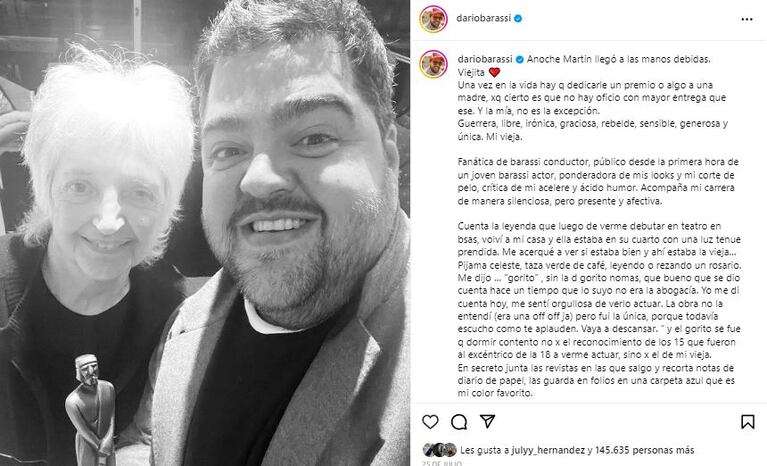 DARÍO BARASSI HIZO UN DESGARRADOR POSTEO DEDICADO A SU MAMÁ EN EL DÍA DE LA MADRE