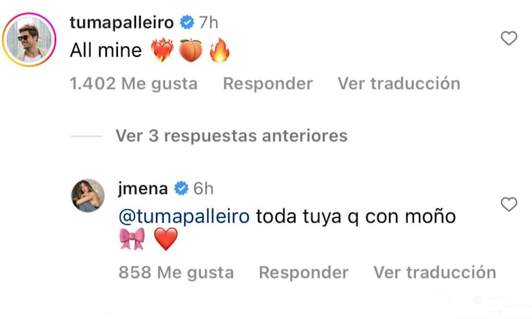 “Todo mío”, escribió “Tuma”, junto a emojis de duraznos, ¿en referencia a la cola de su novia?, fueguitos y corazones. “Soy toda tuya, con moño”, sentenció Jimena, súper enamorada de su novio, con quien la química es innegable.