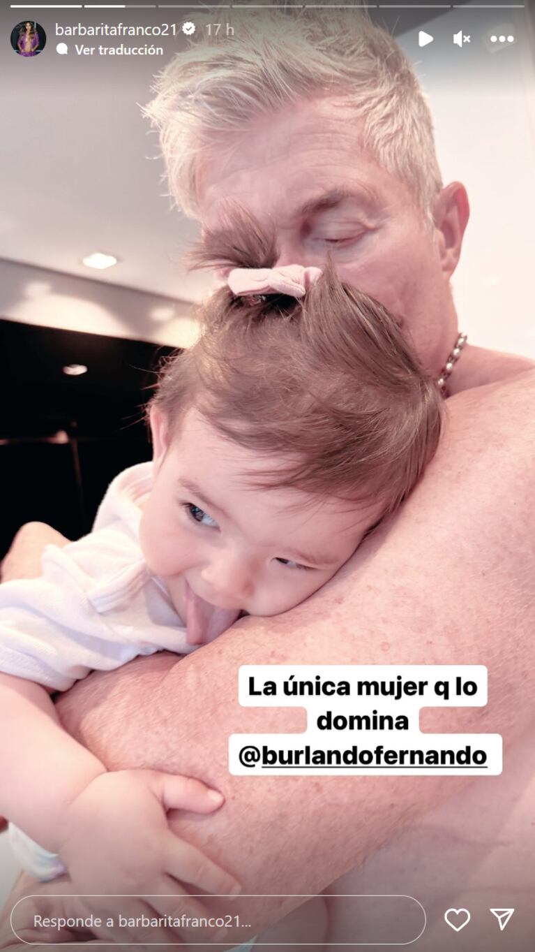 Muy dulce, Barby compartió una tierna foto que muestra a Fernando haciéndole “upa” a su hija, mientras la pequeña lo abraza a más no poder con ambos bracitos y, entre risas, saca la lengua. “La única mujer que lo domina”, expresó Barby, divertida, etiquetando a su pareja. ¡Y sí!