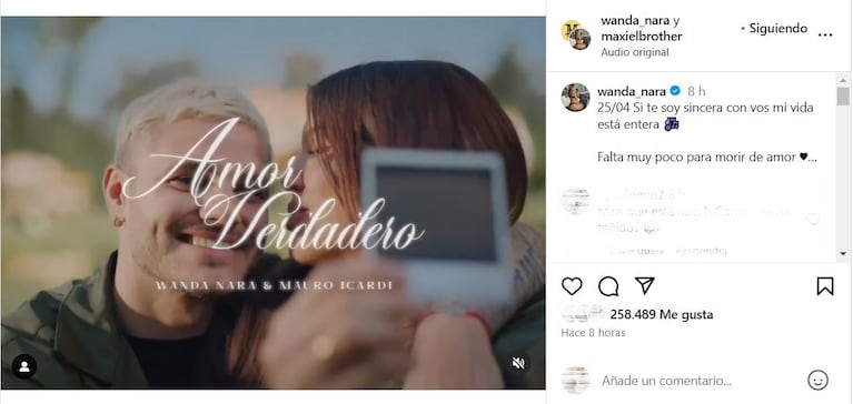 “25/04 Si te soy sincera, con vos, mi vida está entera”, escribió Wanda en su cuenta personal de Instagram, dejando en claro que en pocas horas, sus seguidores podrán disfrutar de esta nueva canción.