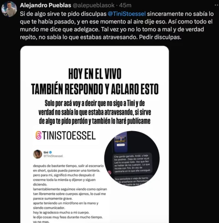 En este contexto, Alejandro se disculpó con Tini mediante un firme mensaje en X (Twitter), aclarándole que no sabía por lo que había pasado en este último tiempo y aceptando que estuvo mal decir que la ve muy delgada.