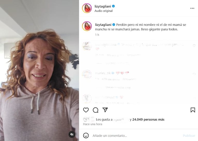 La publicación recibió todo tipo de comentarios, algunos de sus amigos famosos apoyando sus palabras, y agregó unas contundentes líneas en su muro: “Perdón, pero ni mi nombre, ni el de mi mamá, se mancha ni se manchará jamás. Beso gigante para todos”.