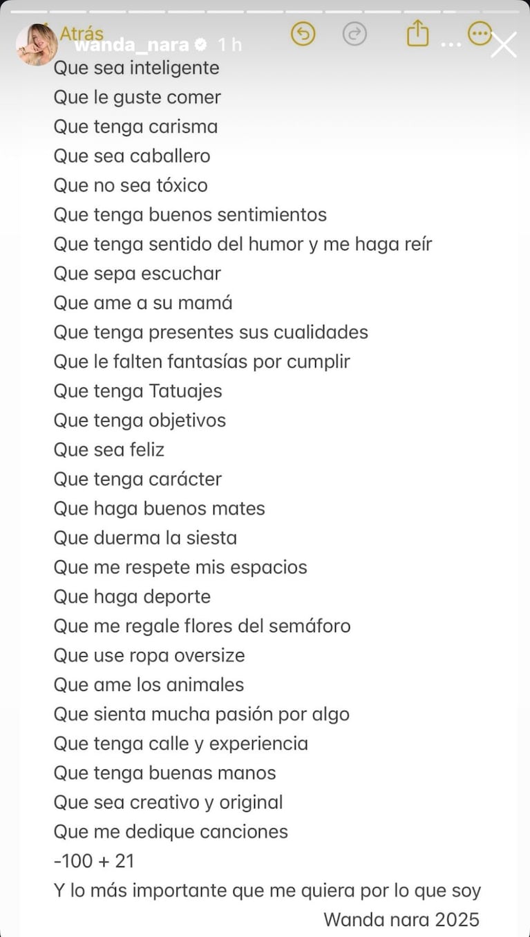 “Que me regale flores del semáforo, que use ropa oversize, que ame los animales, que sienta mucha pasión por algo, que tenga calle y experiencia, que tenga buenas manos, que sea creativo y original, que me dedique canciones, que no tena más de 100 y más de 21 años; y lo más importante que me quiera por lo que soy”, cerró Wanda su lista.