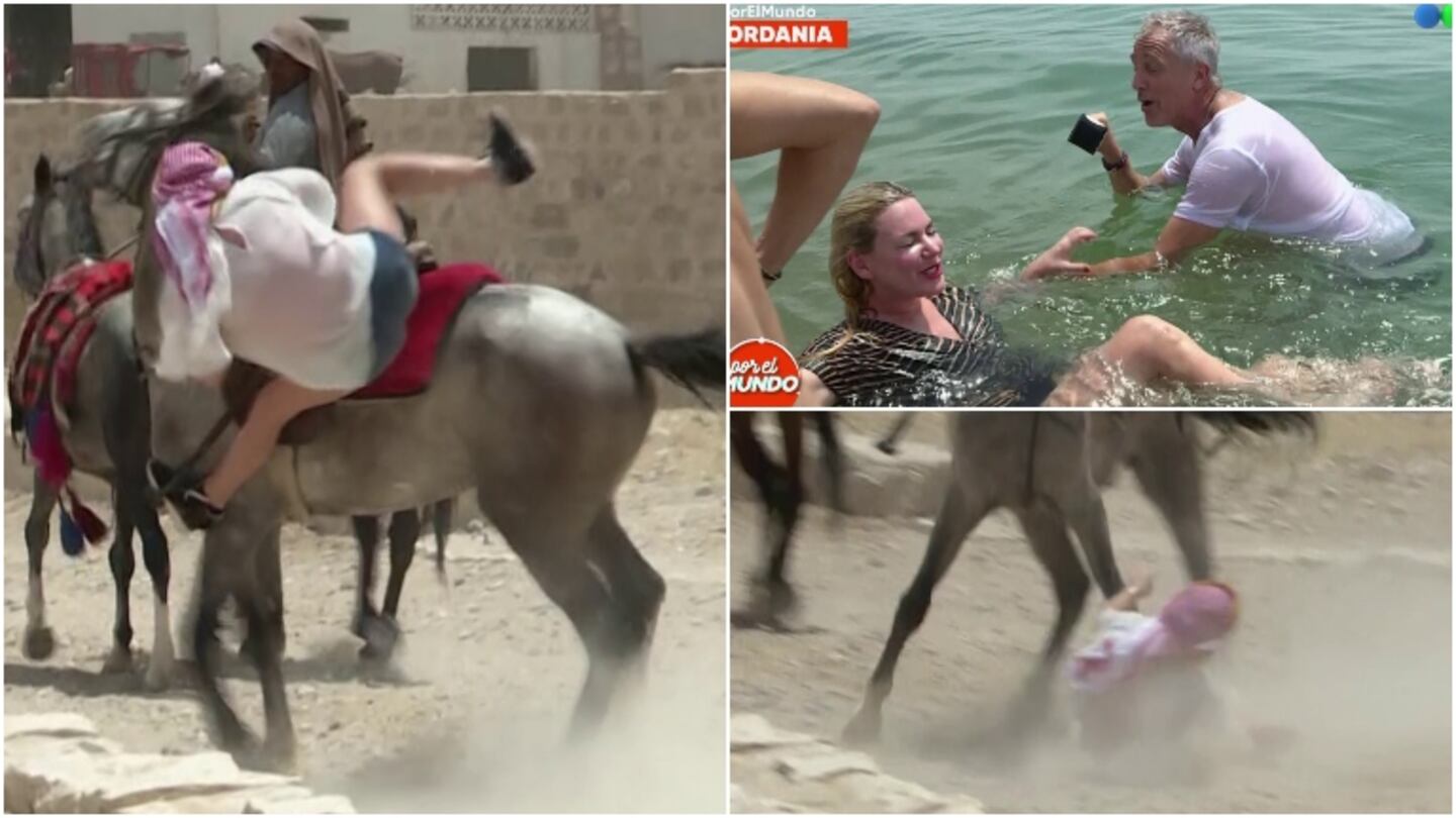 La actriz quiso montar a caballo en Petra, un importante enclave arqueológico del país, y terminó golpéandose tras ser despedida por el animal. “¿Sabés andar a caballo?”, le consultó el conductor, preocupado al ver la velocidad que había tomado. “Salté toda mi vida a caballo. Mi padre cría caballos árabes”, afirmó, segurísima, antes de su accidente, por el que sólo terminó con algunos raspones y moretones.