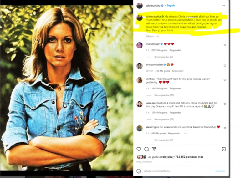 "Mi queridísima Olivia, hiciste que nuestras vidas fueran mucho mejores. Tu impacto fue increíble. Te quiero mucho. Te veremos en el camino y estaremos todos juntos de nuevo", escribió Travolta junto a una foto de la actriz.