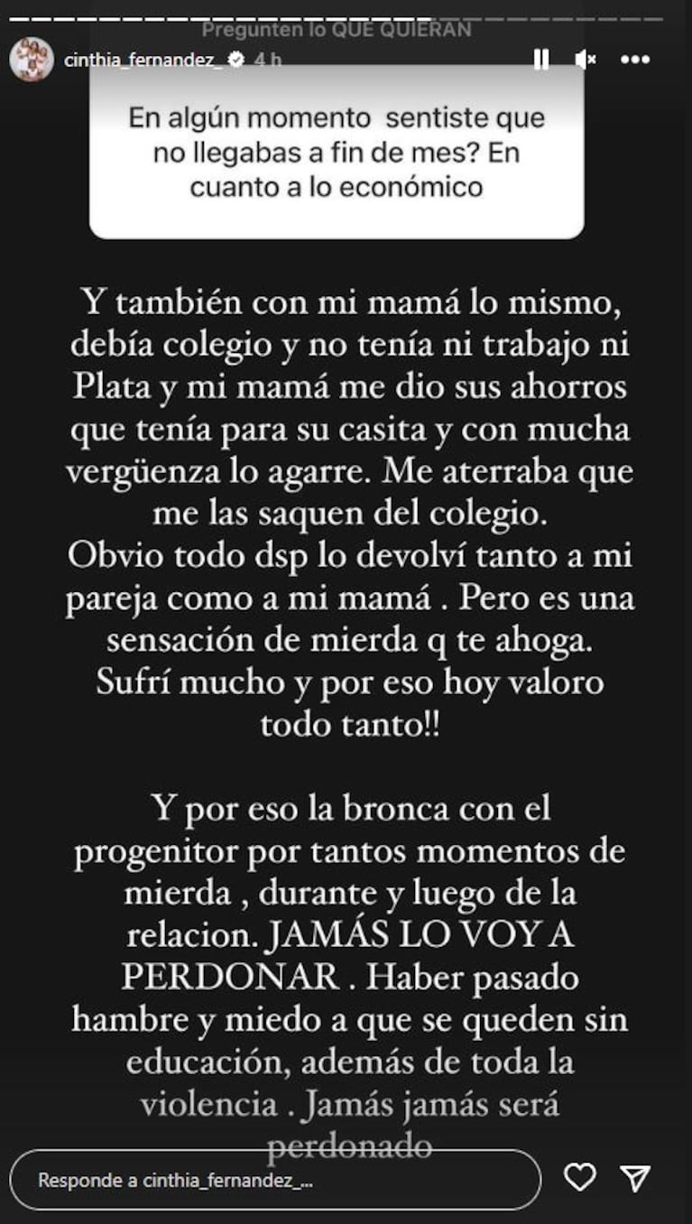 “Por eso la bronca con el progenitor por tantos momentos de mierda, durante y luego de la relación. Jamás lo voy a perdonar. Haber pasado hambre y miedo a que se queden sin educación, además de toda la violencia, jamás será perdonado”, aseguró.