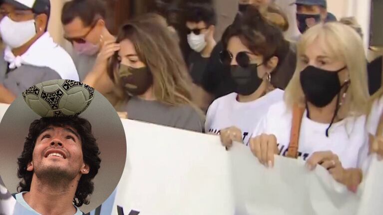 Acompañados de un gran grupo de hombres de seguridad y personas que siguen con la línea de pensamiento de la familia de Maradona, que acusa al cuerpo médico y Matías Morla (abogado del Diez), de ser autores del deceso del ídolo, la exmujer de Diego y sus hijas arribaron al lugar ante el estallido de la prensa y de personas que se agolparon para pedir Justicia.