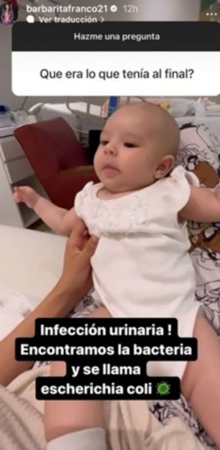 En este contexto, la mamá de la pequeña contó cuál fue la bacteria que afectó a su hija. "Tenía infección urinaria, encontramos la bacteria y se llama escherichia coli", explicó Barby, más tranquila.