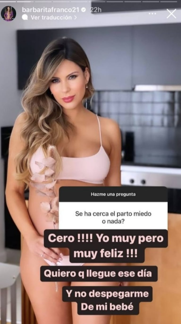 "Cero. Yo muy pero muy feliz. Quiero que llegue ese día. Y no despegarme de mi bebé", sentenció Barby, ilusionada.