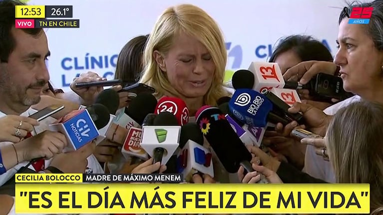 Emocionada y conmovida, Cecilia Bolocco brindó una conferencia de prensa sobre el estado de salud de su hijo, Máximo Menem, en la Clínica Las Condes, de Santiago de Chile. El joven, que hoy cumplió 15 años y recibió el alta médica, fue operado el viernes durante siete horas para extraerle un tumor cerebral.
