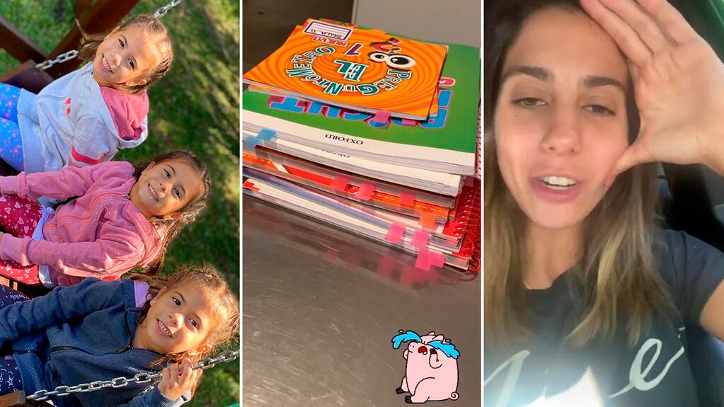 En este contexto, Cinthia Fernández contó a través de sus historias de Instagram que está agotada. A sus nenas, Charis, Bella y Francesca, le mandan constantemente un montón de tarea y material para que estudien en casa.