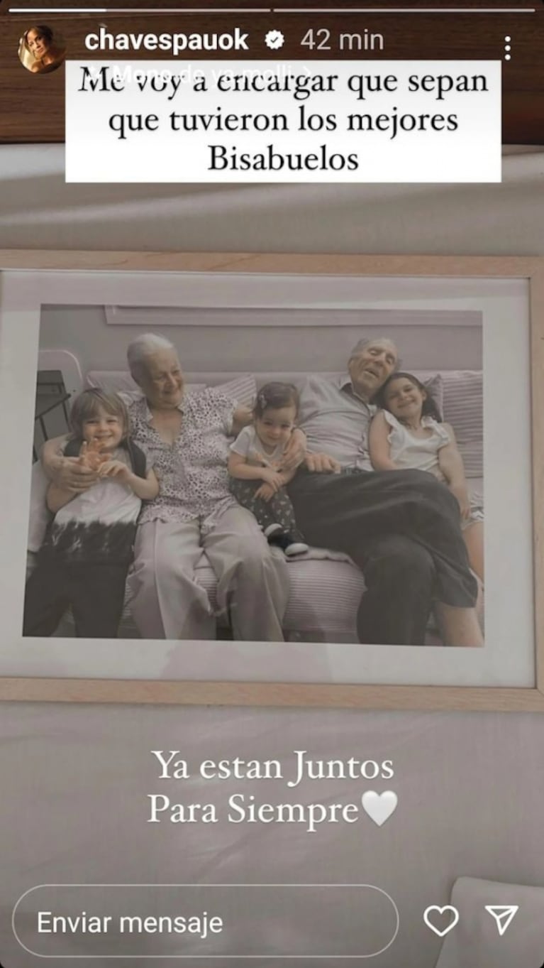En sus redes sociales, la pareja de Pedro Alfonso dejó un emotivo mensaje con una foto familiar: “Me voy a encargar de que sepan que tuvieron a los mejores bisabuelos. Ya están juntos para siempre”.