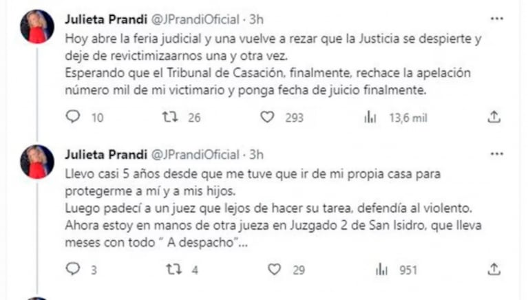 "A él escráchenlo solito en una pantalla gigante, pero no ilustren más con una imagen mía sonriendo en mi boda o yo saliendo del sanatorio cuando nacieron mis hijos", agregó Julieta, madre de Mateo y Rocco.