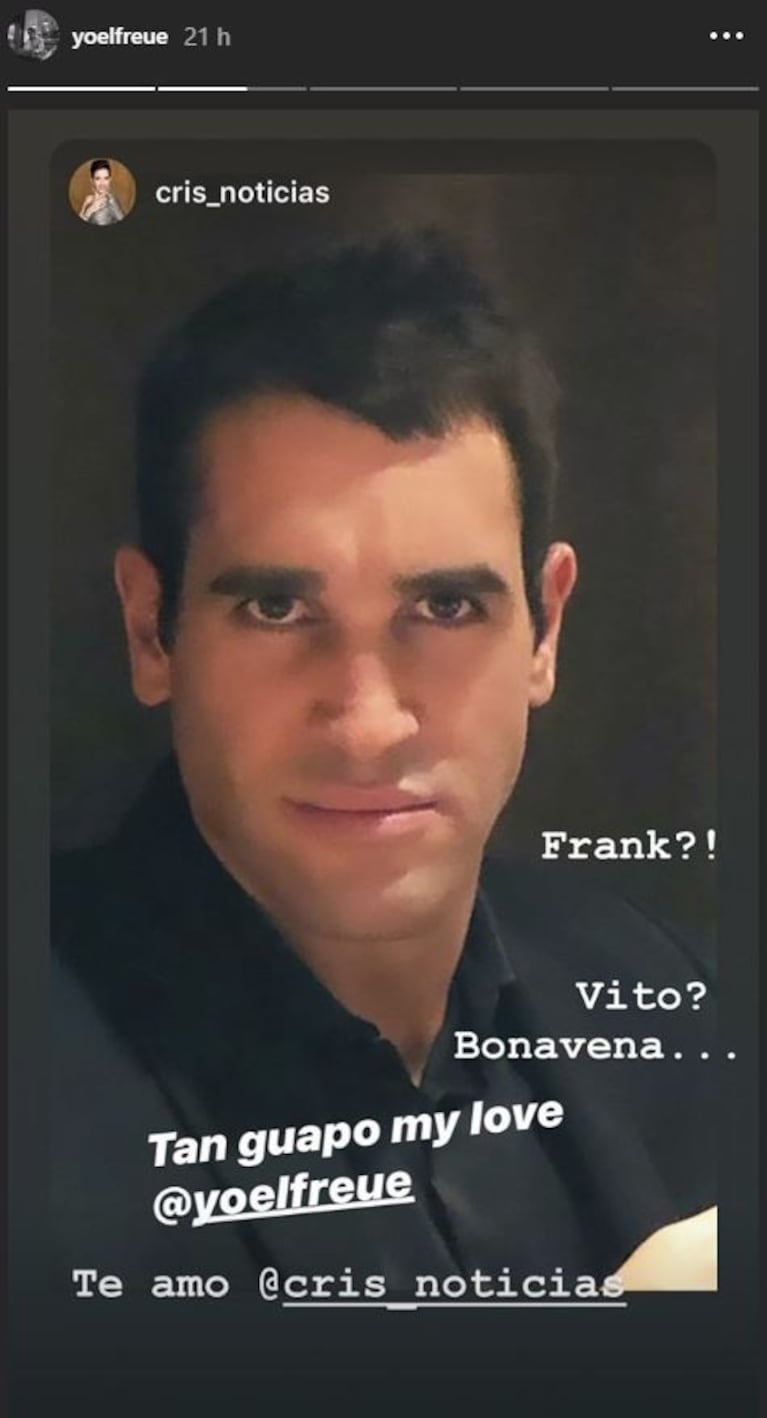 La periodista y su novio se muestran desde sus cuentas de Instagram muy enamorados y esta vez fue ella quien le dedicó mensajes de amor: “Tan guapo, my love”, escribió, junto a una foto de su pareja y él no tardó en responderle. “¿Frank? ¿Vito? Bonavena. Te amo”, le contestó él desde las Stories.