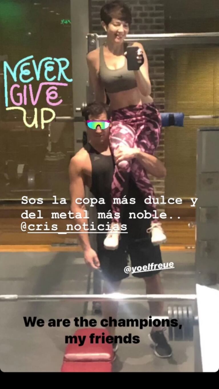 “Gente que arruina selfies”, escribió Cristina, muy divertida en un video que compartió en su cuenta personal de Instagram. En el clip se puede ver a la periodista con look deportivo posando frente al espejo cuando es sorprendida de atrás por su novio, quien la levanta en brazos.