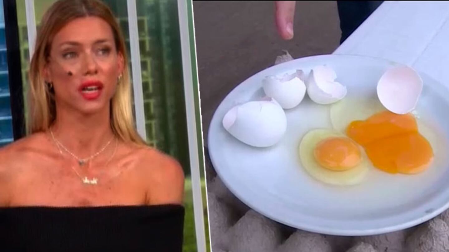 "Nos quedamos en Cañuelas para mostrarte los huevos. Huevos de campo, fijate el color de la yema. También hay huevo de doble yema", dijo el cronista, mientras en pantalla se veían varios huevos rotos. Atenta a la imágen, la panelista acotó: "Es de una gallina feliz".