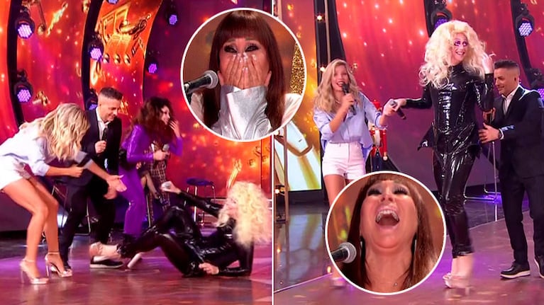 "Seguimos en el Cantando. Le conseguimos tacos a Dan Breitman. Ahora sí tiene los tacos de la gran Moria Casán, que se los prestó en el corte”, dijo Ángel de Brito, sin imaginar que el participante trastabillaría y se caería al piso.