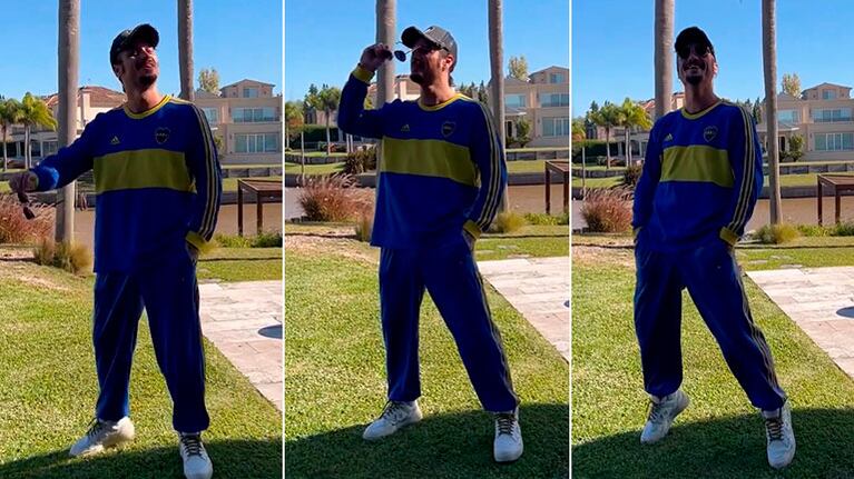 Vestido con el buzo y el pantalón de Boca, así se lo vio aparecer en un jardín, poniéndose los anteojos de sol; muy canchero e imitando a Guillermo Francella, que es hincha de Racing.
