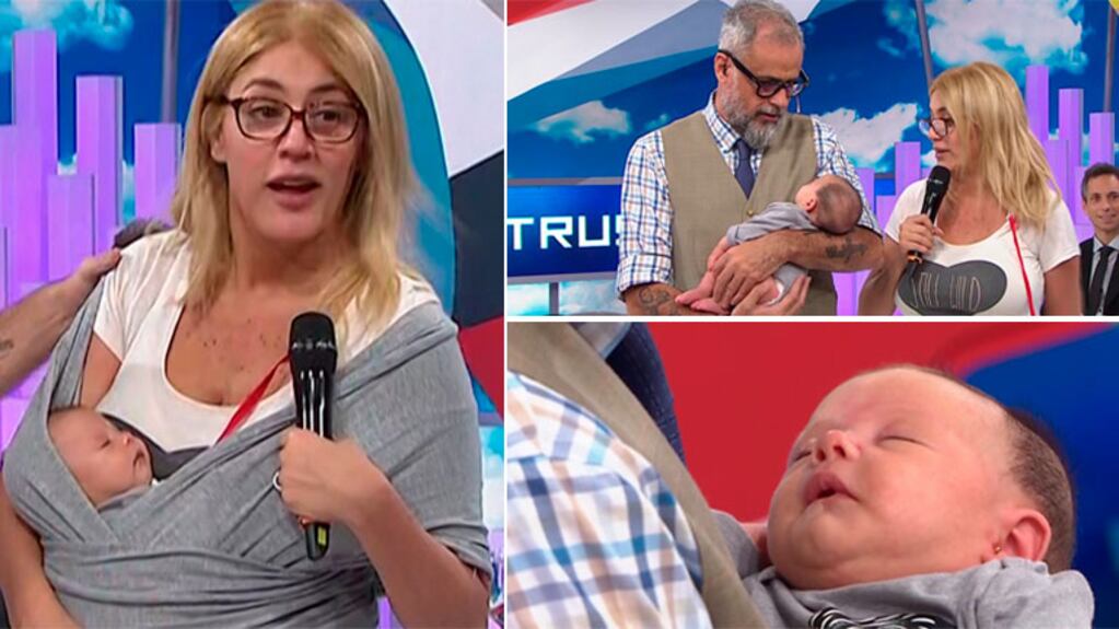 A un mes y medio de ser mamá, y tras presentarla en sociedad en un móvil con Intrusos, Débora D'Amato (45) visitó el programa de Jorge Rial con su hija Lola, quien dormía plácidamente en el fular, hasta ser entregada a los brazos del conductor.
