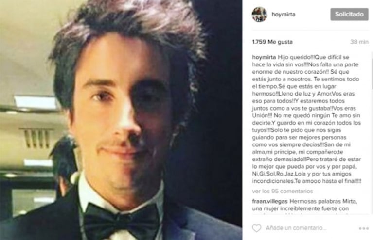 “¡¡¡Hijo querido!!! ¡¡¡Qué difícil se hace la vida sin vos!!! ¡¡Nos falta una parte enorme de nuestro corazón!! Sé que estás junto a nosotros. Te sentimos todo el tiempo. ¡¡Sé que estás en lugar hermoso!! Lleno de luz y Amor. ¡¡Vos eras eso para todos!! ¡¡Y estaremos todos juntos como a vos te gustaba!! ¡¡¡Vos eras Unión!!! No me quedó ningún Te amo sin decirte. ¡¡¡Y guardo en mi corazón todos los tuyos!!! ¡¡¡Solo te pido que nos sigas guiando para ser mejores personas como vos siempre decías!!! San de mi alma, mi príncipe, mi compañero, ¡¡te extraño demasiado!! Pero trataré de estar lo mejor que pueda por vos y por papá, Ni, Gi, Sol, Ro, Jaz, Lola y por tus amigos incondicionales. ¡¡¡Te amooo hasta el final!!!”.