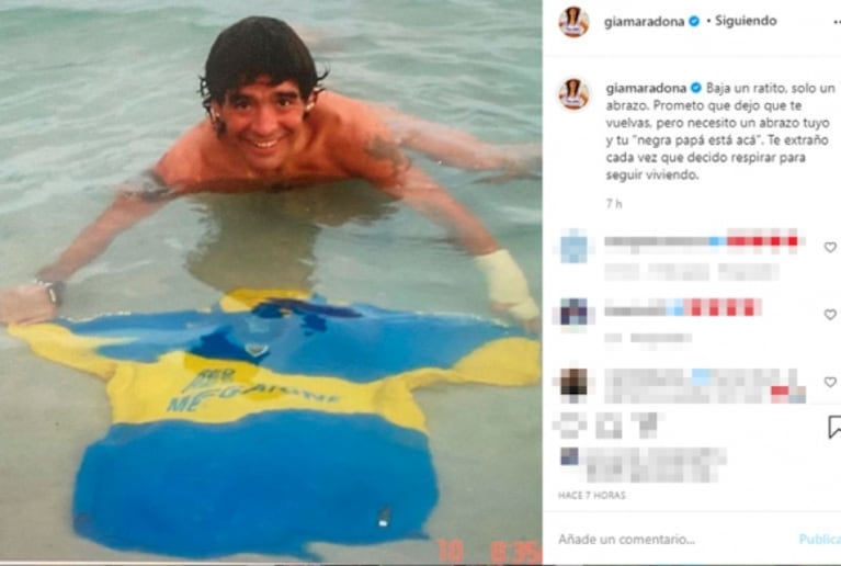 La hermana de Dalma recordó a Diego en Instagram con una foto en el mar junto a una remera de su amado Boca y escribió sobre el difícil duelo que transita: “Bajá un ratito, solo un abrazo. Prometo que dejo que te vuelvas, pero necesito un abrazo tuyo y tu ‘negra papá está acá’”.