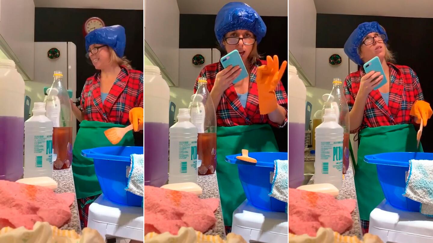 "Sí, Floppy, es muy corrosiva. Yo las había lavado, las había puesto en la heladera, las saqué, las volví a lavar y las puse sobre la mesada de la cocina, anoche a las diez y media. Las sequé bien y a las dos y media de la mañana sentí... '¡bum!', de vuelta. ¡Explotó una!, le saqué una foto", arranca el audio de la mamá de Flor, a quien se la ve en la cocina, rodeada de varios productos de limpieza y desinfección, vestida con una cofia improvisada, guantes de goma y un delantal.