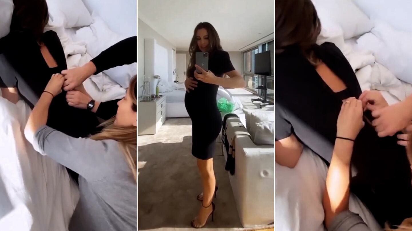 "¡Me creció del viernes a hoy! Tiene que cerrar, dale con fuerza", se la escucha decir a Carolina en el video en el que se la ve recostada boca abajo en la cama mientras tres personas hacen maniobras imposibles para intentar subirle el cierre del vestido.