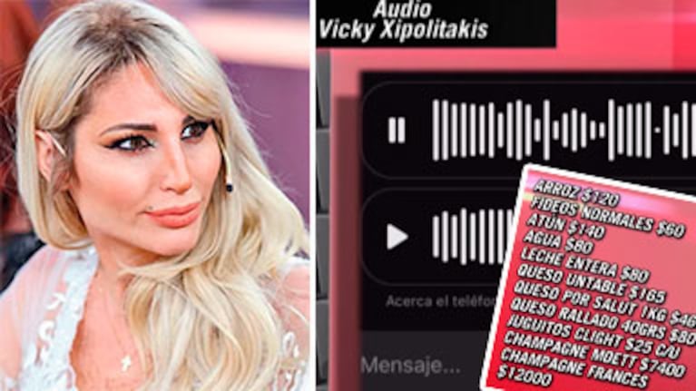 Por si se olvidaba algo, Vicky Xipolitakis recurrió a una cuarta nota de voz para sumar más productos: "Fijate si me podés agregar arroz, lata de atún, queso rallado, juguitos, porque me estoy olvidando de unas cositas. Vi que tenés champagnes riquísimos, me encantaría tener para un brindis. Fijate lo que podés agregar. Armate un buen combo, algo copado, yo te estoy pasando muy poquitas cosas. Algo abundante, que no quede poquito".