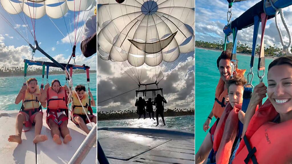 La conductora de Pampita Online practicó parasail, el deporte acuático, junto a su marido, Roberto García Moritán, y sus hijos con Benjamín Vicuña, Benicio, Beltrán y Bautista.