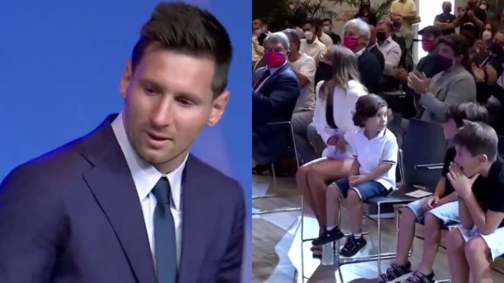 Superado por la emoción, Lionel Messi llegó a la conferencia de prensa para su despedida del Barcelona acompañado por su familia. Las lágrimas del astro del fútbol hicieron que Antonela Roccuzzo, en primera fila junto a sus hijos, le entregara un pañuelo descartable a su marido.
