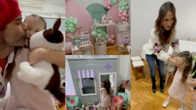El actor capturó la dulce reacción de su pequeña, a quien le taparon los ojos antes de que viera todos los preparativos que organizaron para la ocasión con globos de distintos colores, cosas ricas y una casita que simulaba ser una veterinaria con muchos animalitos de peluche.