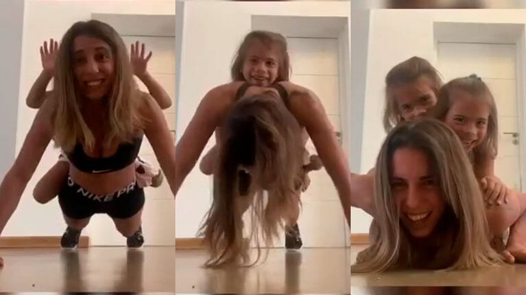 “Chip and Dale jajajajajaja. Se entrena con peso pesadas”, escribió con humor junto al video que la muestra haciendo las exigentes flexiones de brazos con las nenas arriba.