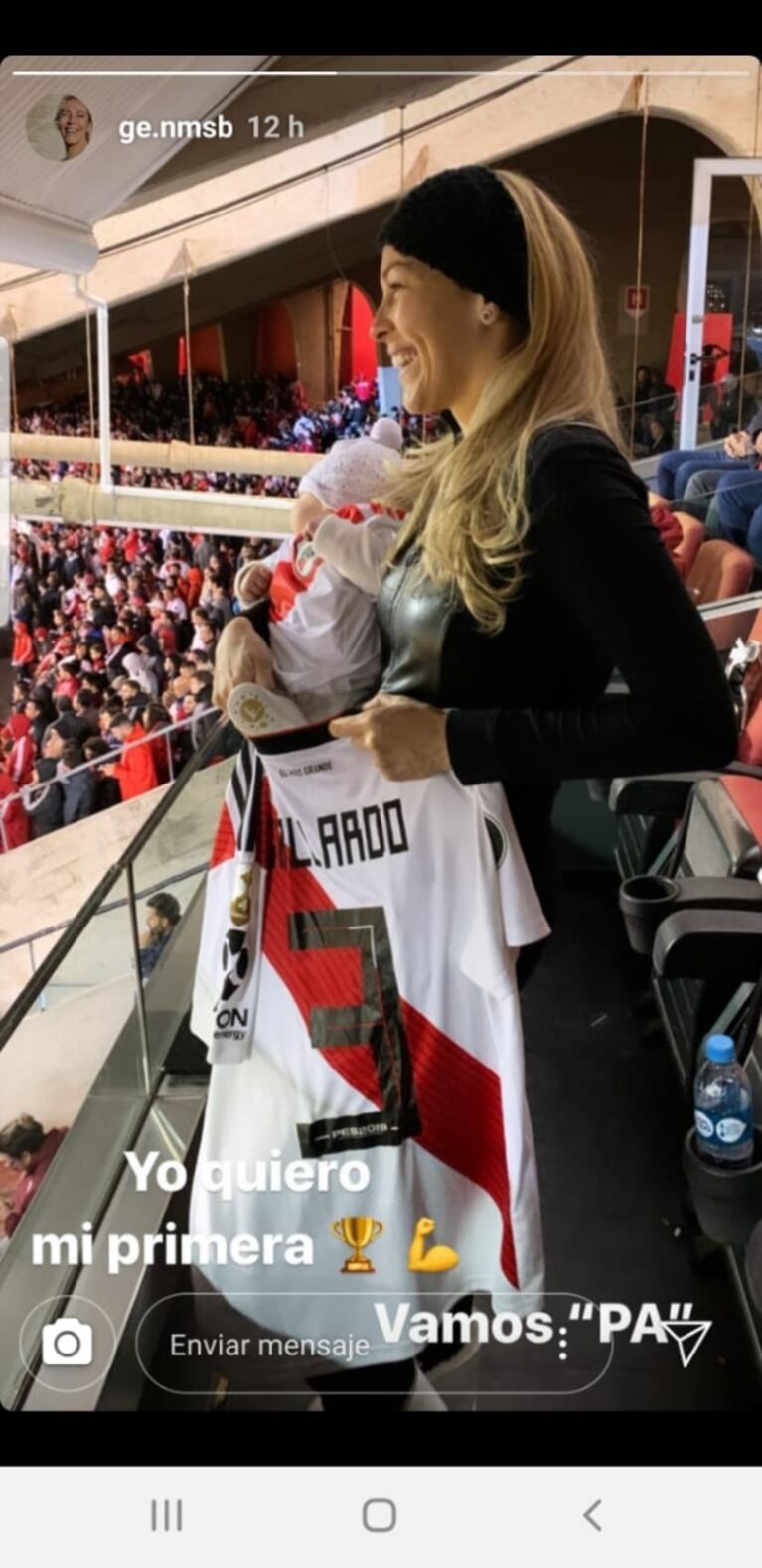 Como una fanática más, la diseñadora de modas compartió una tierna postal a través desde su Instagram Stories desde uno de los palcos vip del Monumental con su hijo en brazos. “Yo quiero la primera Copa. Vamos, pá”, escribió en nombre del recién nacido. Súper confiada, Geraldine publicó la foto antes de que el Millonario se imponga en el encuentro ante el Xeneize.