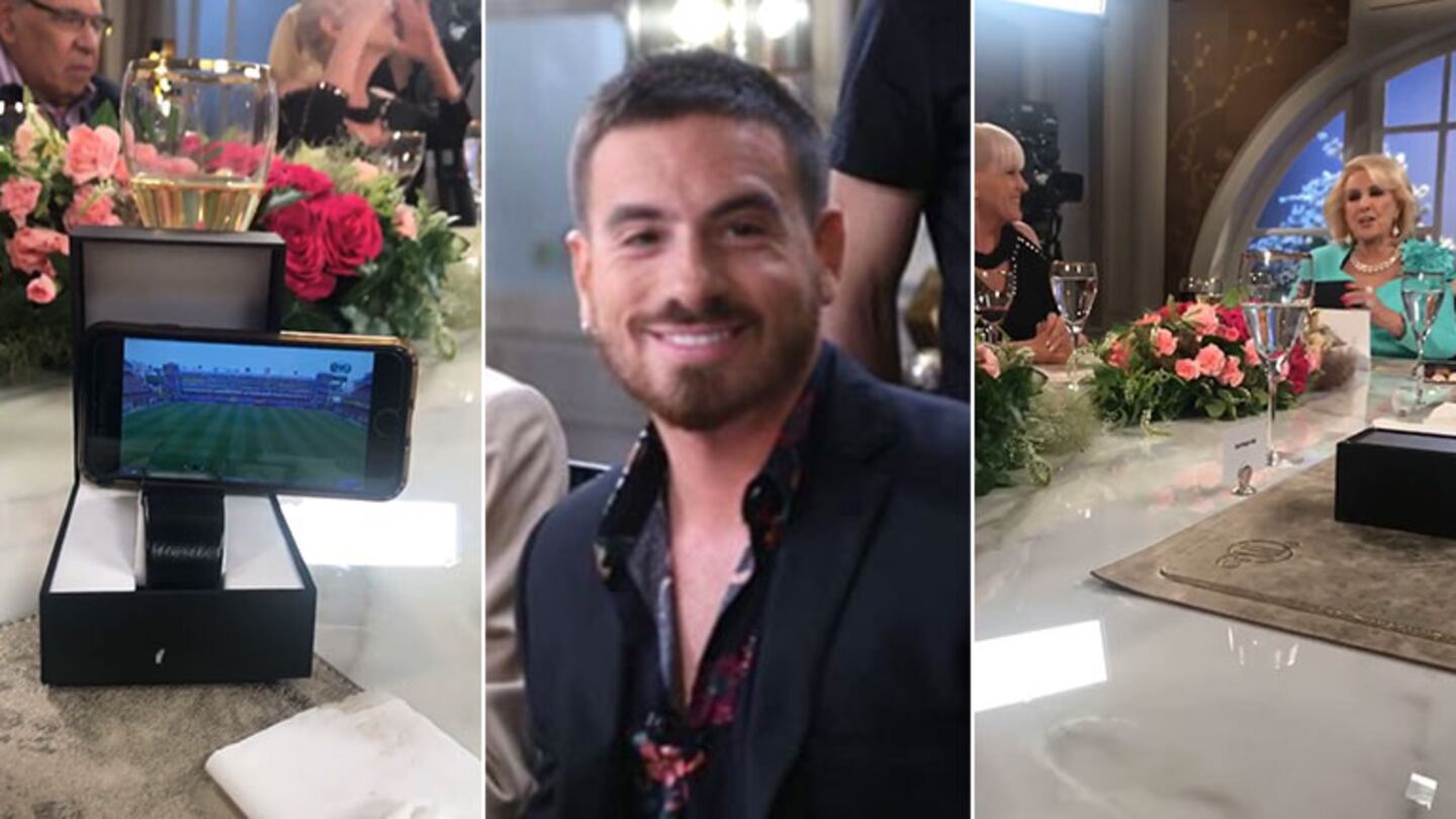 Sobre el final del programa, la diva le obsequió a sus invitados un reloj. Y Bal aprovechó el estuche del regalo de Mirtha para usarlo como soporte de su celular, desde el que siguió la previa y el comienzo de la transmisión.
