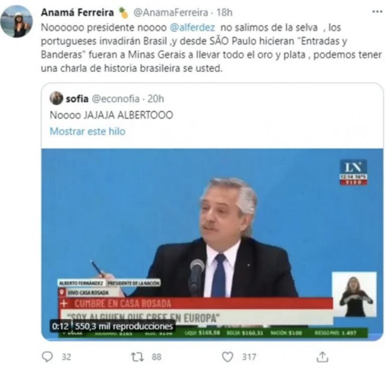 Si bien Fernández pidió disculpas públicamente, Anamá Ferreira, que vive en la Argentina pero nació en Brasil, reaccionó muy filosa. "Tristeza infinita, no somos monos. Un historiador ya, brasilero, para la Casa Rosada", expresó vía Twitter.